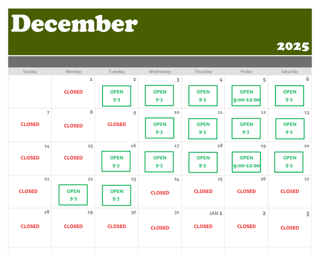 *Please note we are a seasonal business without extra staff in the fall/winter months, and therefore our hours can change without notice. Please check our google listing and/or our answering machine for the current day hours. Thank you for your patience and understanding! Bria & Ty